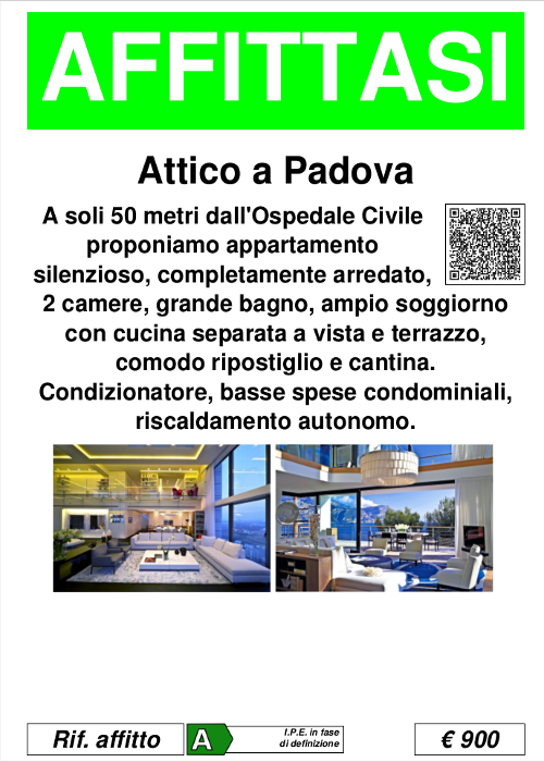Rinnovare la pubblicità in vetrina è semplice: con pochi click e senza alcun programma puoi realizzare cartelli personalizzati con foto e planimetrie. Le vetrofanie sono personalizzabili per colori, dimensioni del titolo e della descrizione, puoi scegliere quali foto stampare e l'impaginazione (verticale o orizzontale) in modo da rendere omogenea e professionale la vetrina della tua agenzia. Inoltre hai la possibilità di inserire i dati e il logo della tua agenzia come intestazione della vetrofania.
